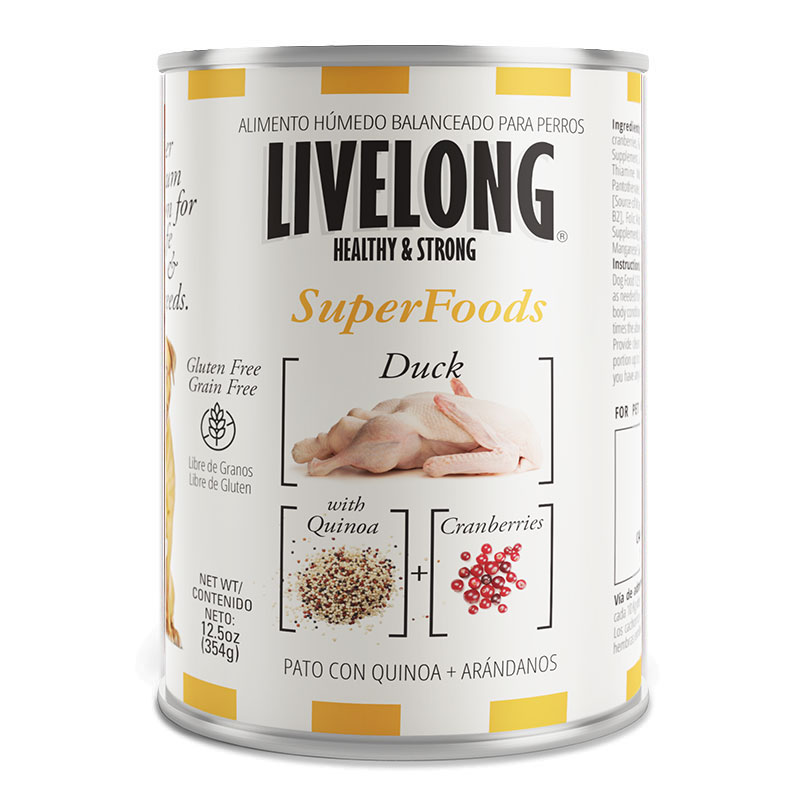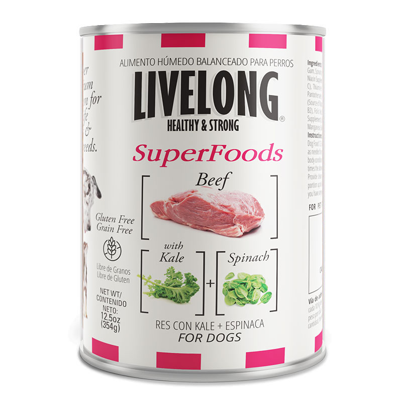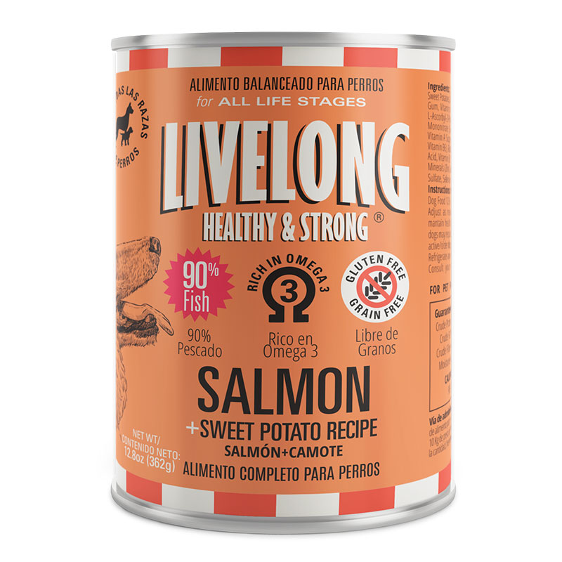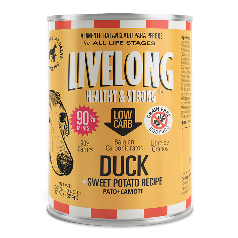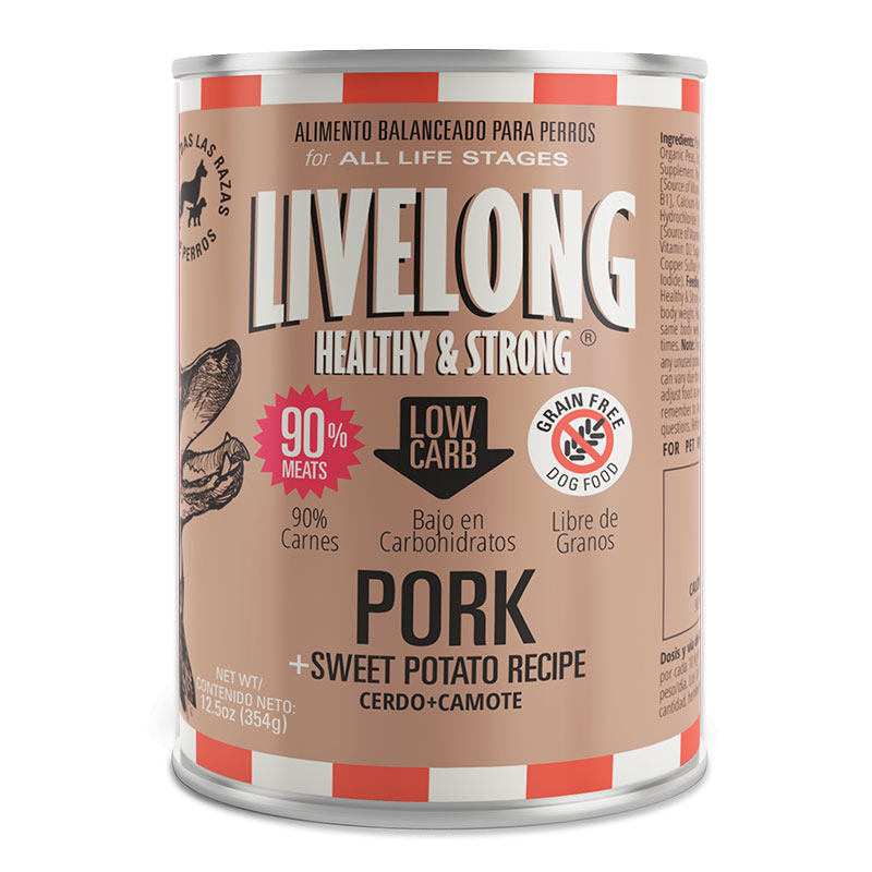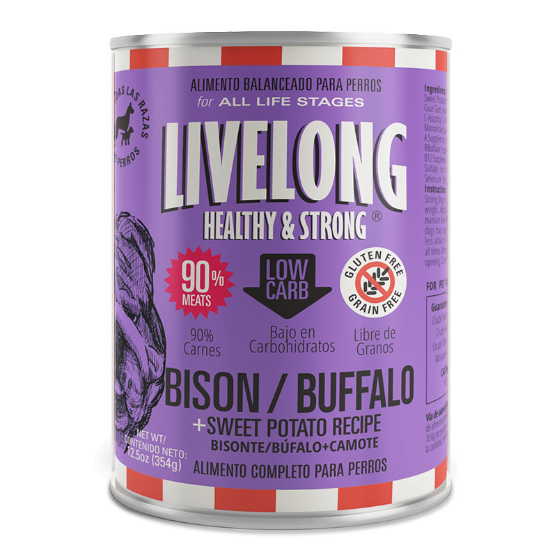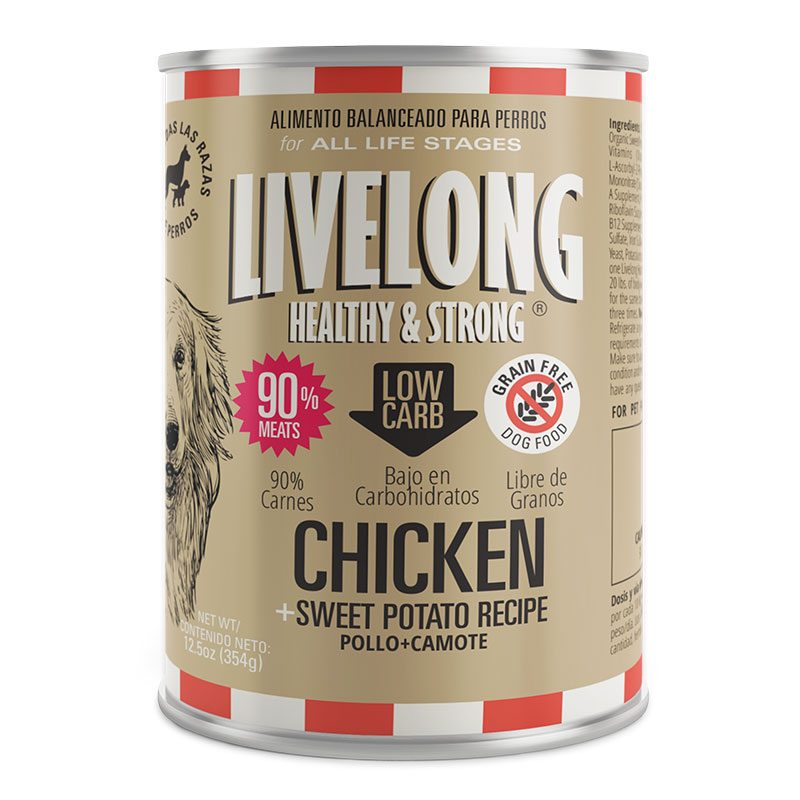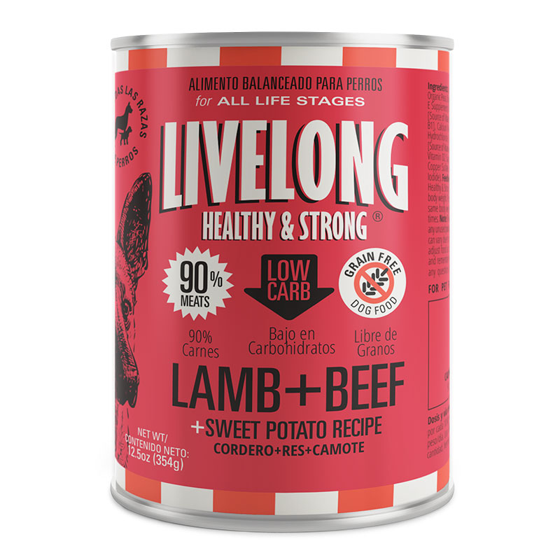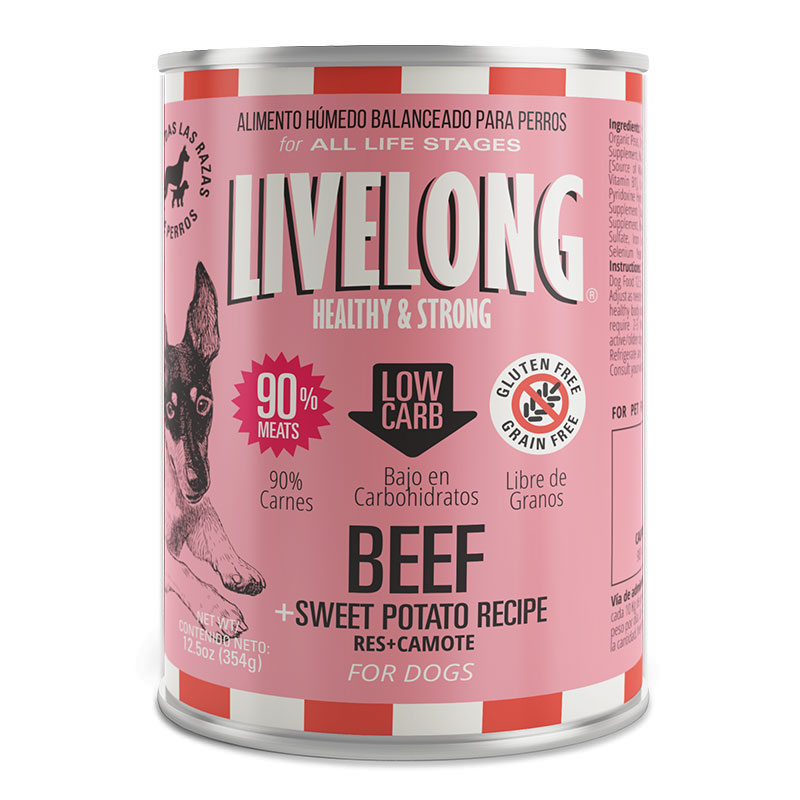 Steamed, with 90% real meat, sweet potatoes, carrots, and peas, it is a complete, low-carb food with a high protein level, 100% natural, and free from preservatives and flavorings. Everything your dog needs has been designed for a longer, healthier, and happier life. LIVELONG NOURISHES AND NOURISHES YOUR DOG!